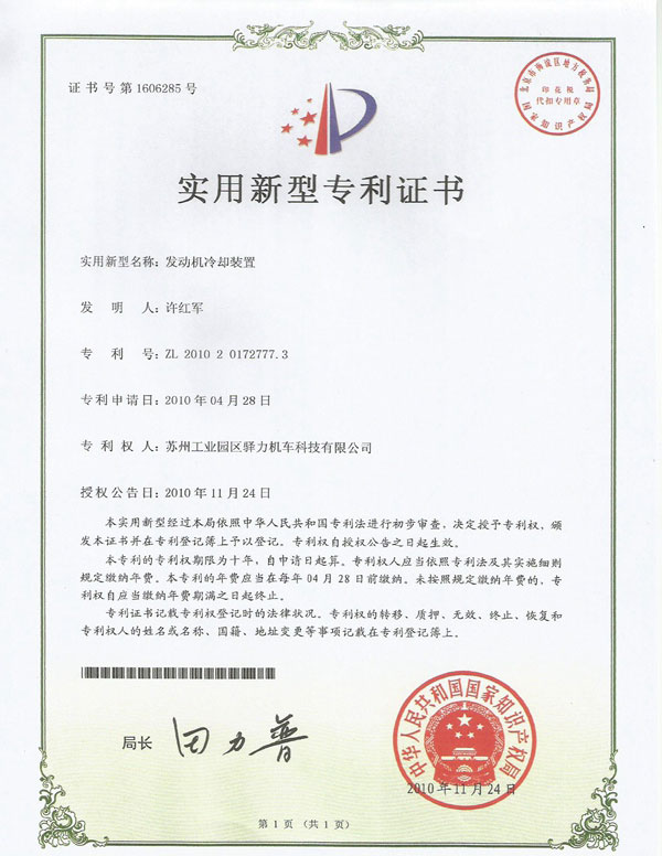 驿力科技发动机冷却装置专利