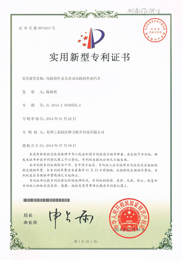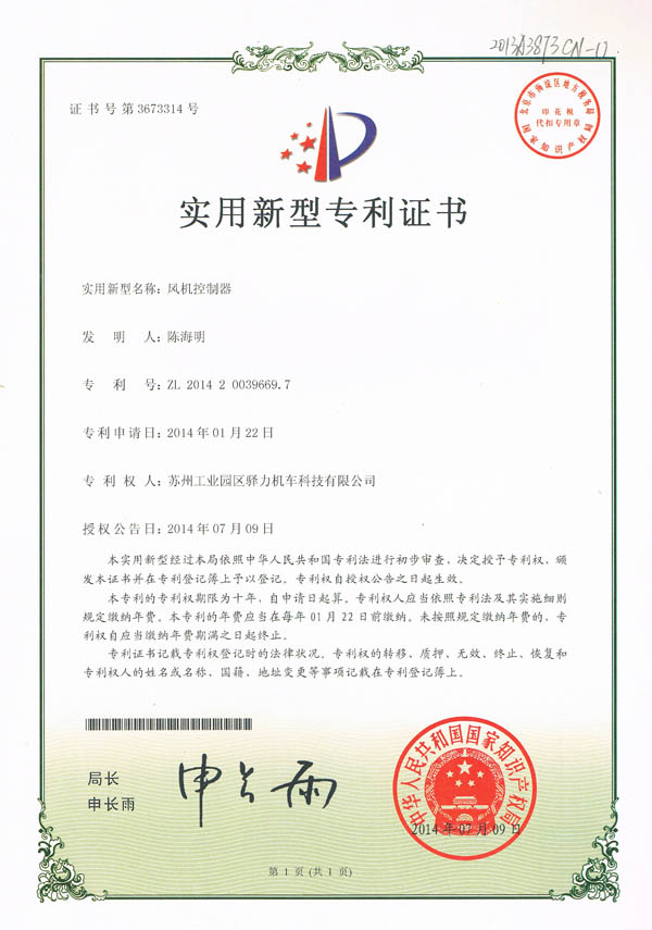 驿力科技风机控制器实用新型专利